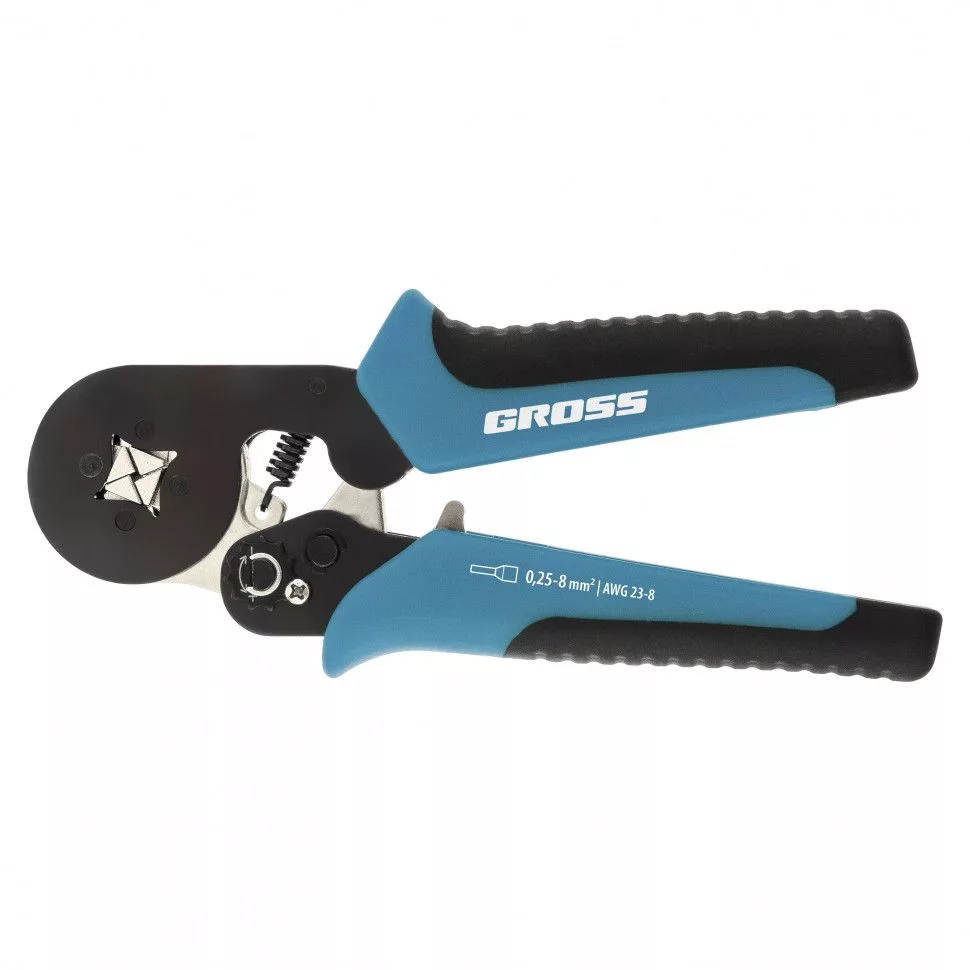 A Gross 17724 érvéghüvely fogót 0,25-8 m2 keresztmetszetû elektromos vezetékek saruinak préselésére használják.