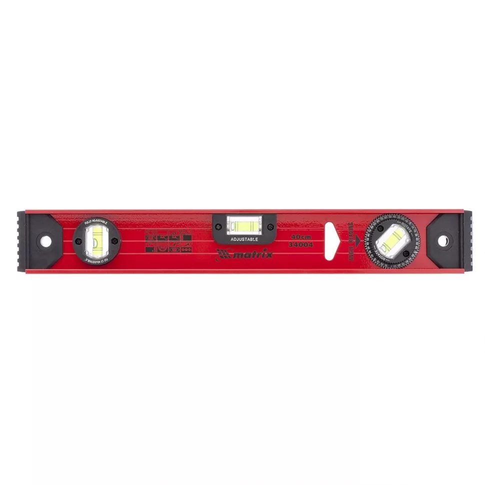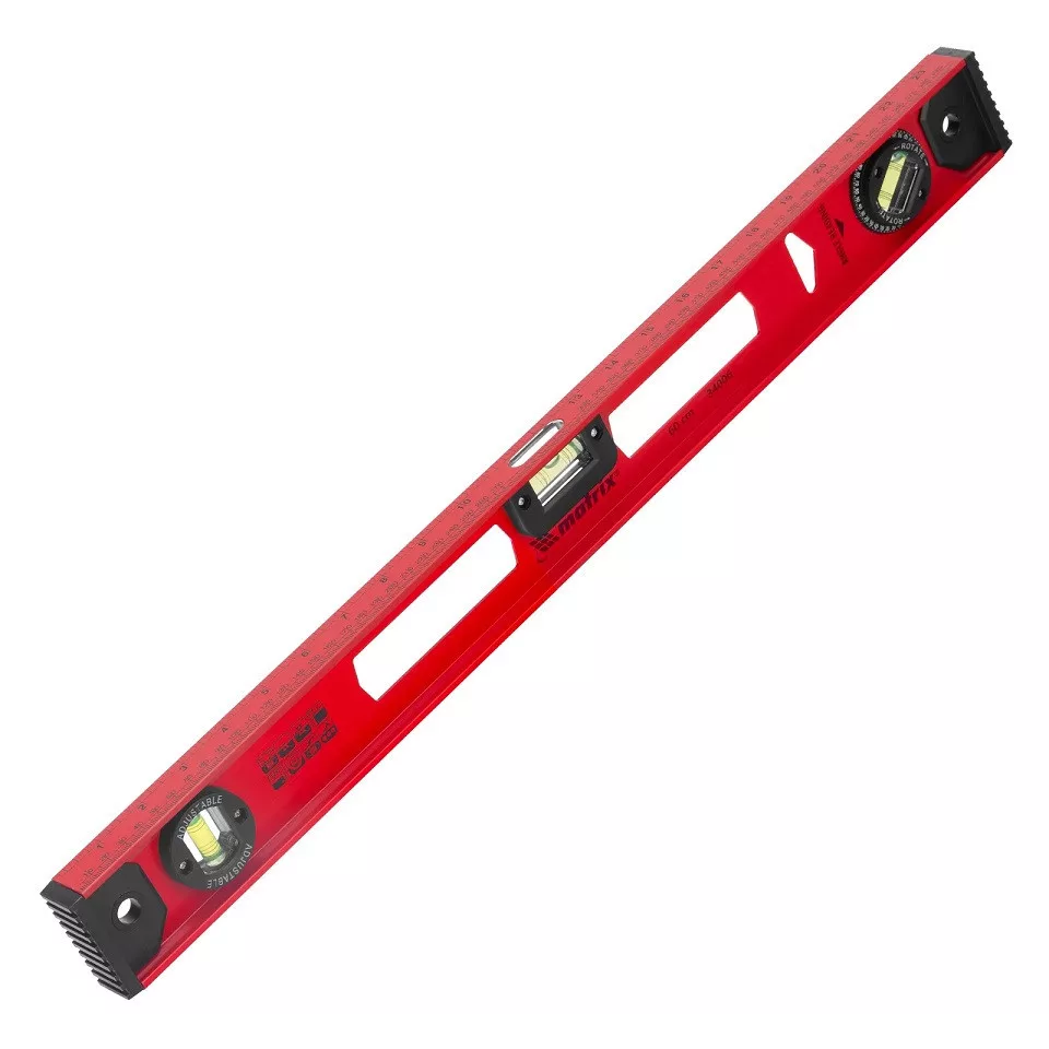 A vízmérték megerõsített alumínium I- profilból készül, a két végén ütéscsillapító gumival és lyukkal szerszámfalon történõ tároláshoz.
