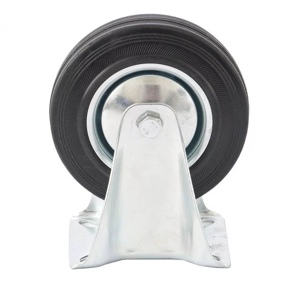 Nagy teherbírású kézi kocsi pótkerék, fekete gumi bevonattal, csapággyal, 4 furatos platform elõkészítéssel.