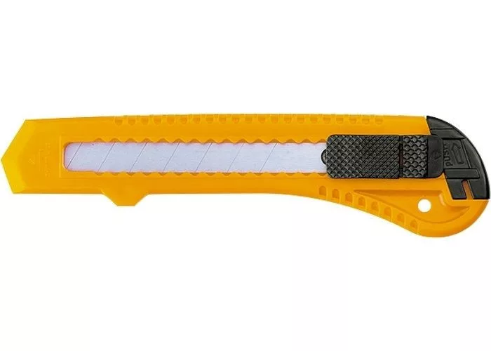 A kés mûanyag tokkal, nyomógombos fékkel és penge rögzítéssel rendelkezik.