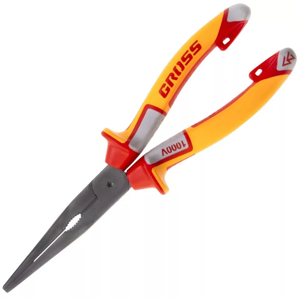 A GROSS 205 mm hosszú csőrös, kúpos fogó egy professzionális kialakítású, 1000 V-ig szigetelt kéziszerszám, amelyet elektromos és precíziós szerelési munkákhoz terveztek.