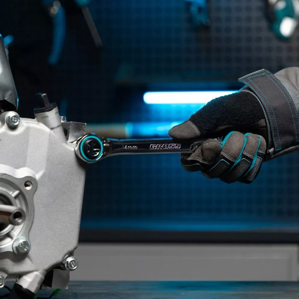 A GROSS 14893 PROFESSIONAL 2 darabos racsnis csillagkulcskészlet innovatív megoldást kínál a helytakarékos és gyors szerelési munkákhoz.