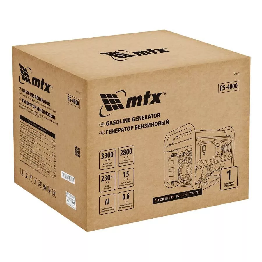 Az MTX RS-4000E 3,3 kW maximális teljesítményű, önindítóval ellátott benzines generátor egy tartalék áramforrás, amely 230 V-os feszültséget támogat. Biztosítja a háztartási gépek, elektromos szerszámok, világítótestek és egyéb fogyasztók működését áramszünet esetén. A fogyasztó csatlakoztatásához 2db 230 V/16 A-es aljzat biztosított. Az AVR egység stabilizálja a feszültséget, amely lehetővé teszi még érzékeny berendezések csatlakoztatását is. A generátor jól jöhet pl. vidéki házban, nyaralóban sátorozáskor.