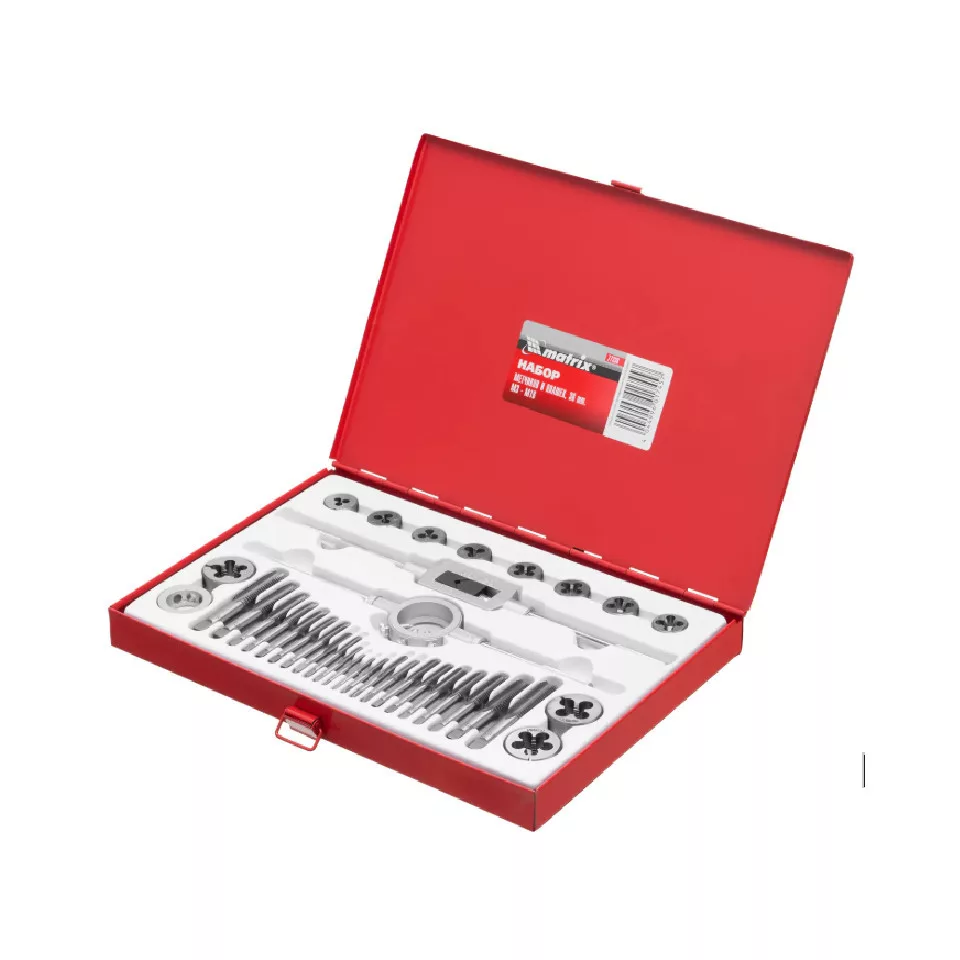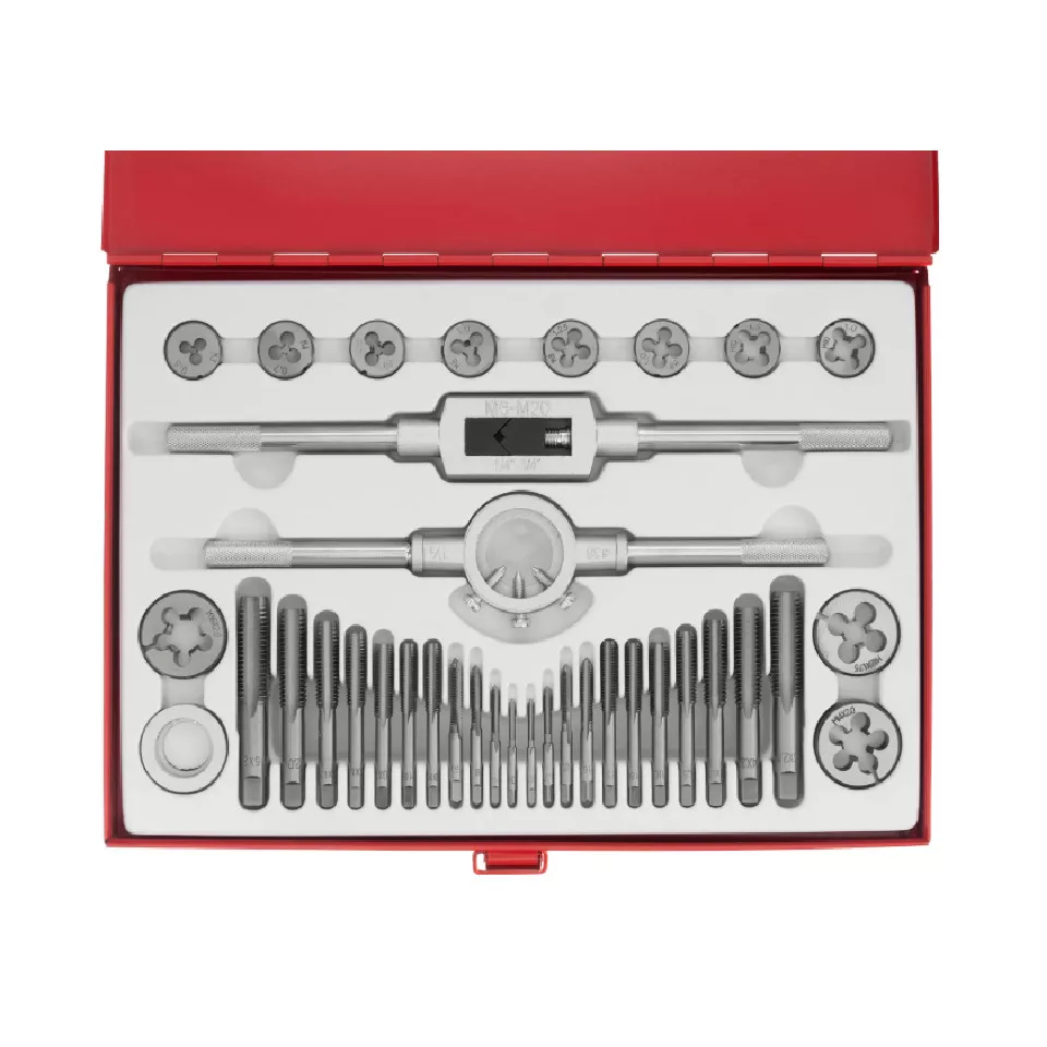 Ez a MTX 77339 metsző- és menetfúró készlet egy teljes, 36 darabos eszközkészlet, amely lehetővé teszi metrikus belső és külső menetek (M3–M16) gyártását és javítását átmenő vagy vakfuratokban. A készlet tartalmaz metszőket (pofákat), csapokat (metfúrókat), tartó- és meghajtó eszközöket, valamint egy tartós fém kofferben rendszerezett tárolást biztosít az eszközöknek.