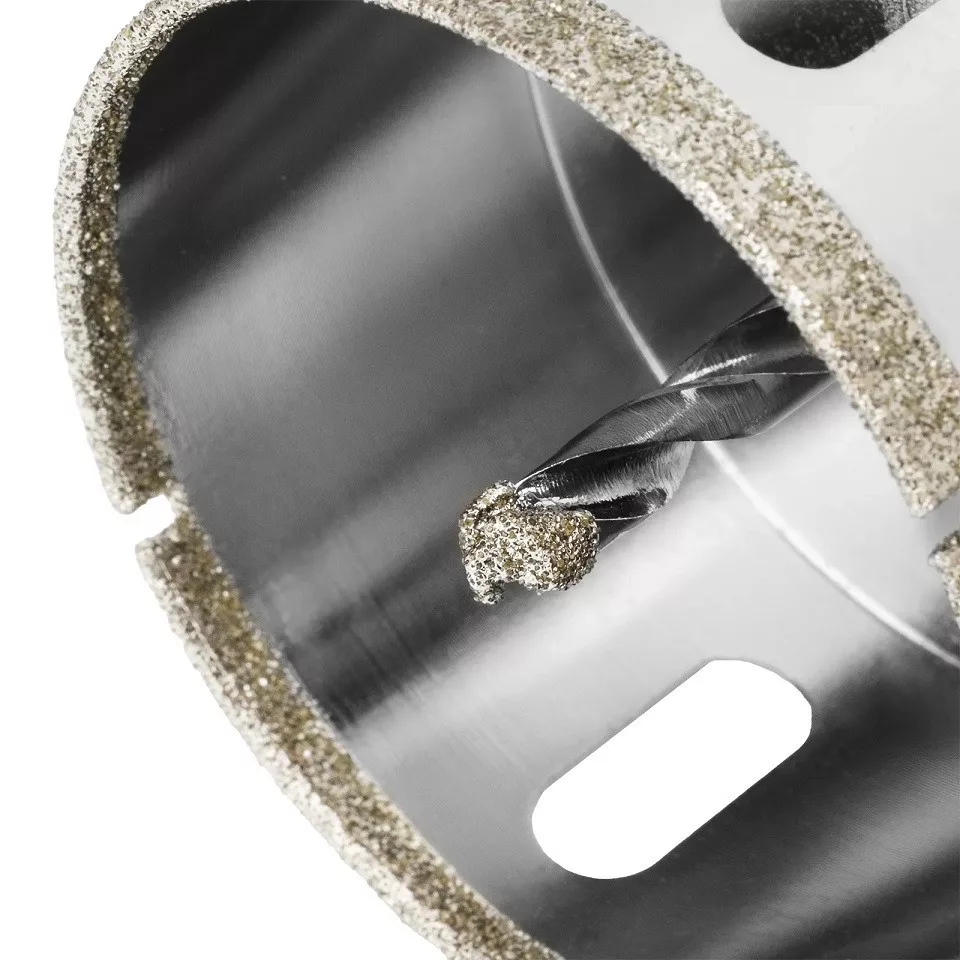 Az MTX gyémánt magfúró készlet két darab, 70 mm átmérőjű fúrót tartalmaz, amelyek ideálisak porcelán kőagyag, kerámia csempe és üveg nagy átmérőjű, tiszta és precíz furatainak készítéséhez.