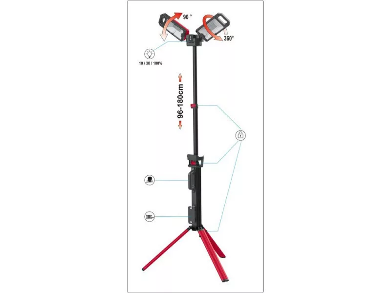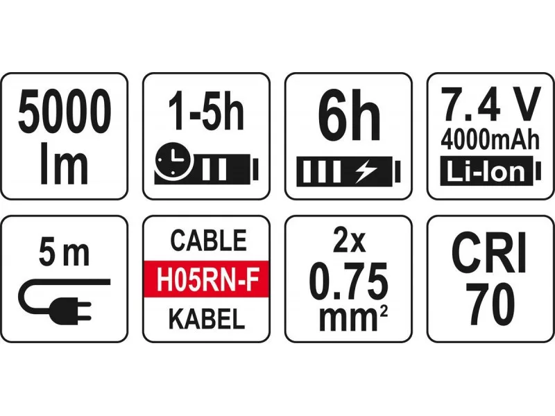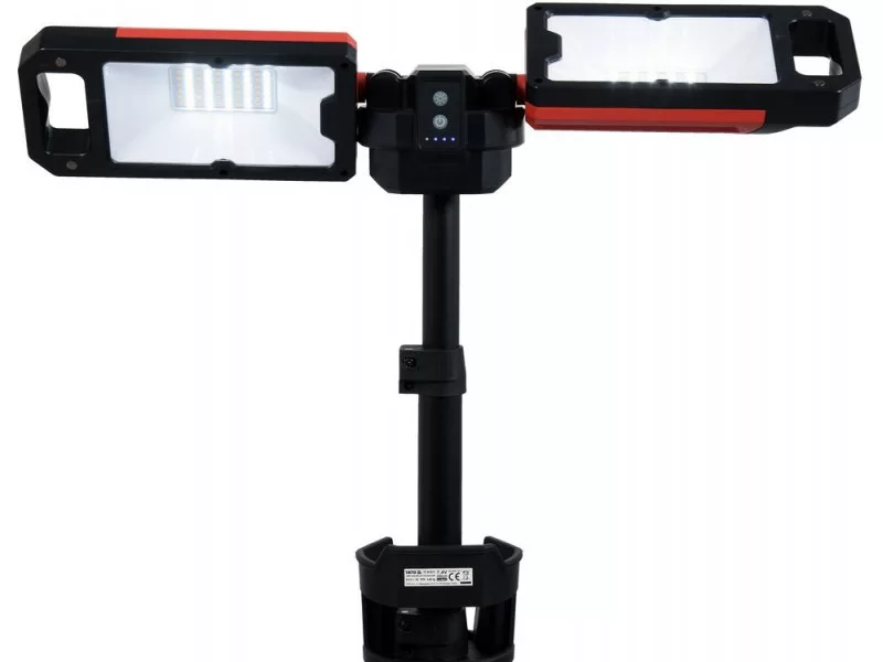 Összecsukható Yato hálózati és újratölthető fejlámpa maximum 5000lm teljesítménnyel. Három mód és két szín világítás lehetővé teszi az illumináció beállítását a tevékenységekhez és az akkumulátor szintjéhez igazítva. Egy erős 7,2V 4000mAh lítium-ion akkumulátorral felszerelve, 1-től 5 óráig működteti a lámpát, és folyamatos működés lehetséges DC hálózati hozzáférés esetén. További előny a szabályozható világítási szög és a állvány magasság.