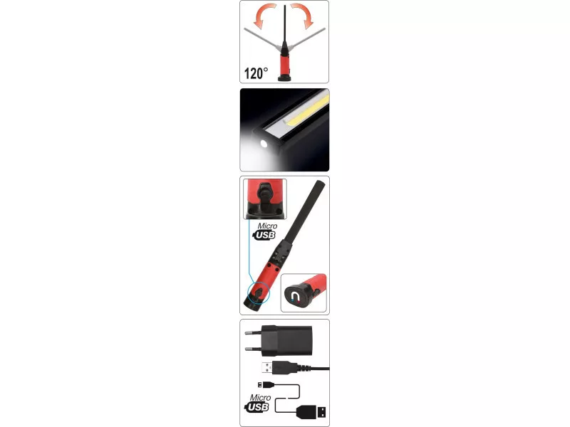 Funkcionális 5W műhelylámpa egy 3W zseblámpával a tetején. A 600 lumen fényerő és a 3 fényüzemmód garantálja a hatékony és kényelmes munkát. Az alsó részen található mágnes lehetővé teszi a lámpa fém alkatrészekhez való rögzítését. A lámpa hosszú, vékony és állítható feje lehetővé teszi a nehezen megvilágítható helyek megvilágítását.