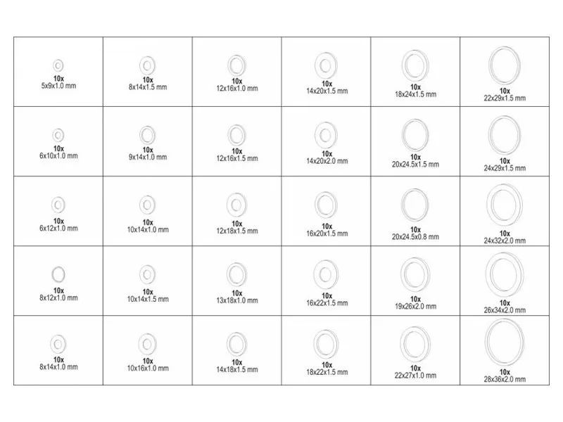 Egy 300 darabos alumínium olajdugó kitömő padok szett. A készlet 5x9x1.0 mm-től 28x36x2.0 mm-ig tartalmaz méreteket. Az egész egy kényelmes "válogató" csomagolásban található.
