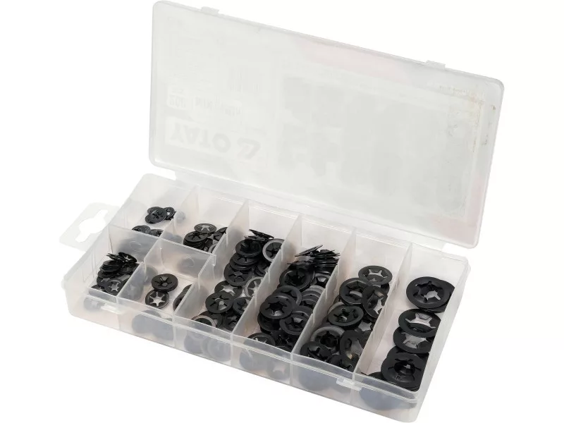 260 darabos biztonsági eszköz készlet. 65 Mn acélból készült méretek: M3 (30 db), M4 (30 db), M5 (40 db), M6 (50 db), M8 (50 db), M10 (40 db), M12 (20 db) rekeszekkel ellátott dobozban csomagolva