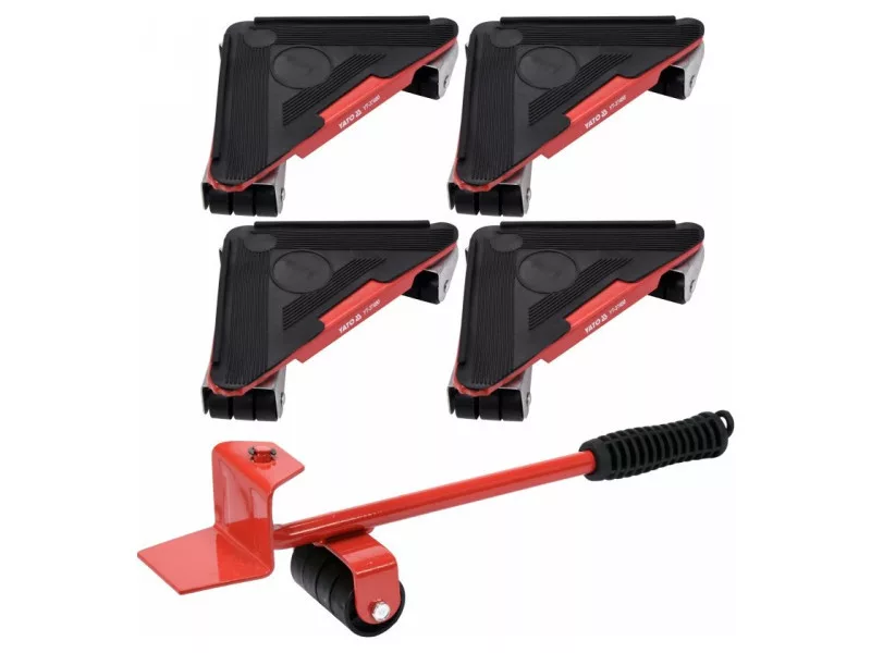 Gumival bélelt fém állványok görgőkkel, amelyeket bútorok vagy más terhek szállítására és elhelyezésére terveztek, legfeljebb 300 kg tömegig. Az acélkar segítségével emeljük fel a terhet, mielőtt beillesztjük a görgőkkel ellátott állványokat. A bútorok és más terhek szállításához, csúsztatásához és elhelyezéséhez, amelyek akár 300 kg-ot is nyomhatnak, emelje fel a szélét, a bútor egyik sarkát egy karral, csúsztassa be a csempét egy görgővel, majd engedje le a terhet. Hasonlóan a többi görgőhöz. Négy állvány görgőkkel, egy kar a bútorok emeléséhez