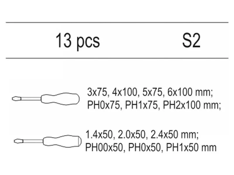 Fiókos patron tartalmaz 13 csavarhúzó készletet. - betét - csavarhúzók 3x75, 5x75, 4x100, 6x100 - csavarhúzók PH0x75, PH1X75, PH2x100 mm - csavarhúzók 1.4x50, 2.0x50, 2.4x50 - csavarhúzók PH00X50, PH0x50, PH1x50 mm