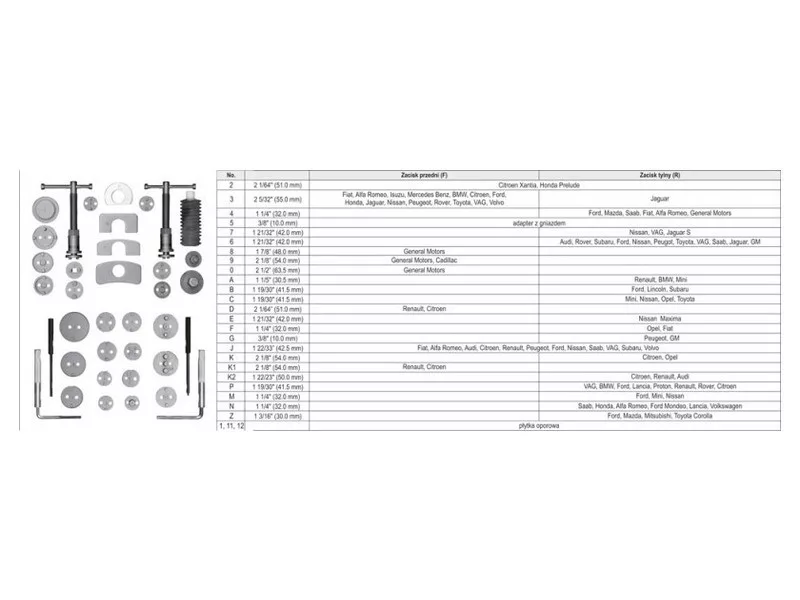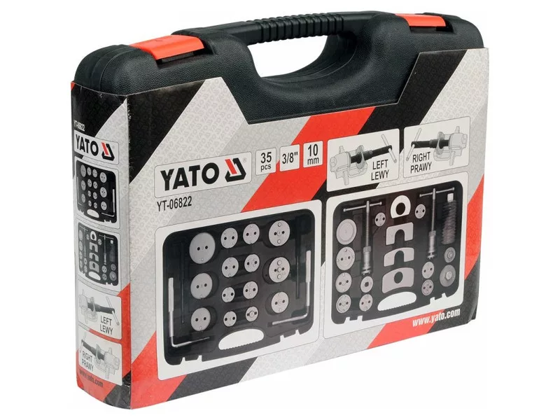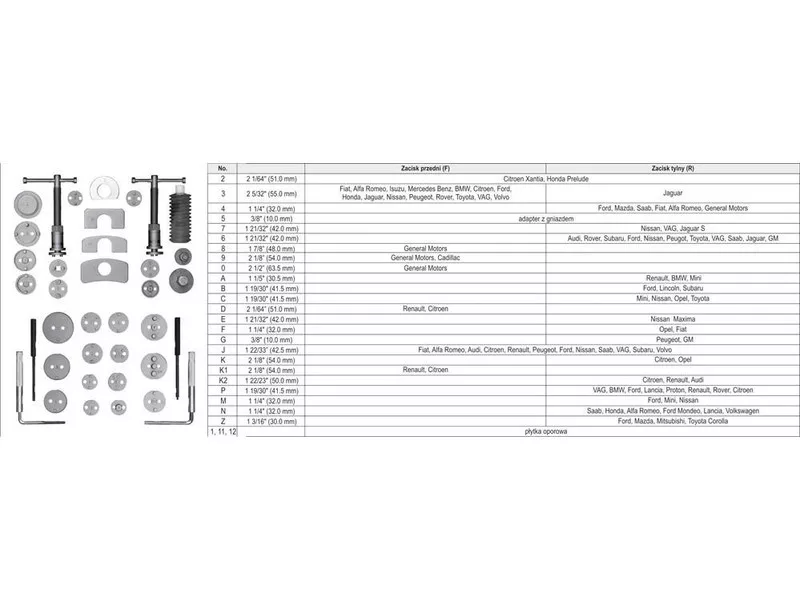 Professzionális féknyereg-szeparátor készlet. A készülék két csavarprésszel - jobb és bal kézre - és egy a legtöbb autómodellhez igazodó lemez készlettel rendelkezik. A készlet 35 elemet tartalmaz. Az egészet egy masszív bőröndben helyezték el.