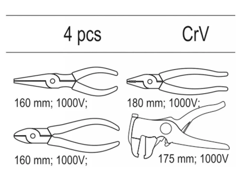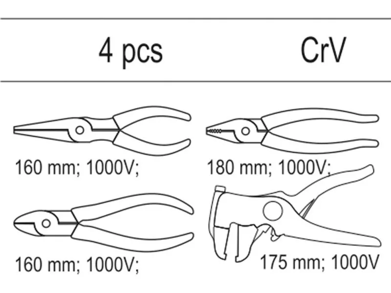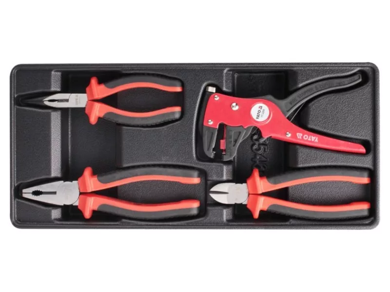 Fiókbetét, amely 4 db szigetelt fogó készletet tartalmaz. - betét - hosszított egyenes fogó VDE YT -2104 Hosszúság 160 mm - univerzális fogó VDE YT-2102 Hosszúság 180 mm - oldalvágó fogó VDE YT -2109 Hosszúság 160 mm - automatikus szigetelő tekerő YT -2268
