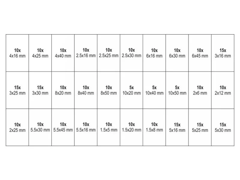 Egy 315 darabos rugalmas/terheléses dübel készlet. A készlet méretei 1,5x5 mm-től 10x50 mm-ig terjednek. Az egész egy praktikus "válogató" csomagolásban található.