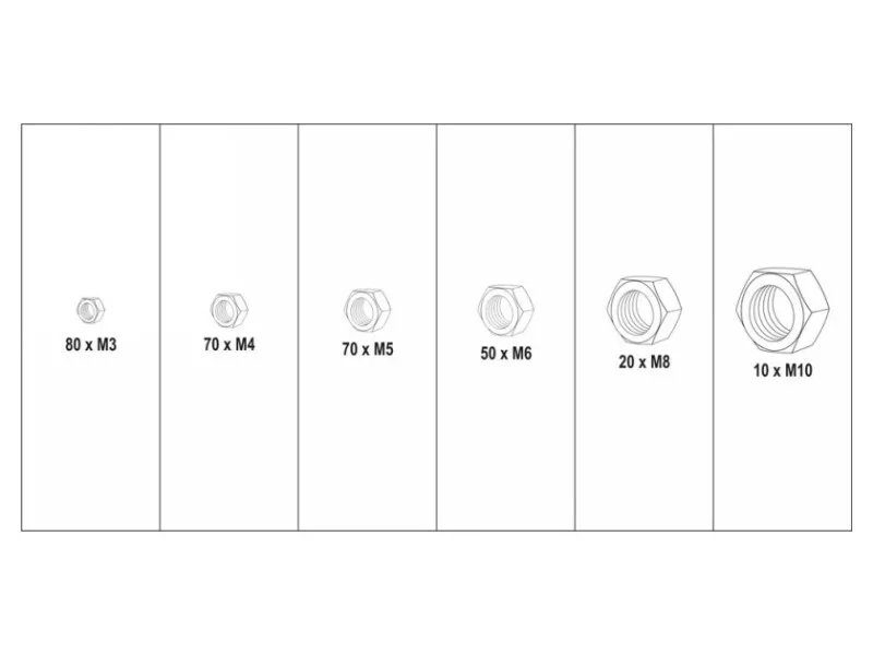 A 300 méretű metrikus kupak készlet tartalmazza a következő méreteket: M3, M4, M5, M6, M8, M10. Az egész egy kényelmes "válogató" csomagolásban található.