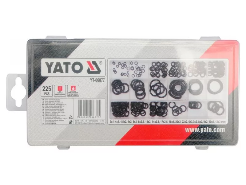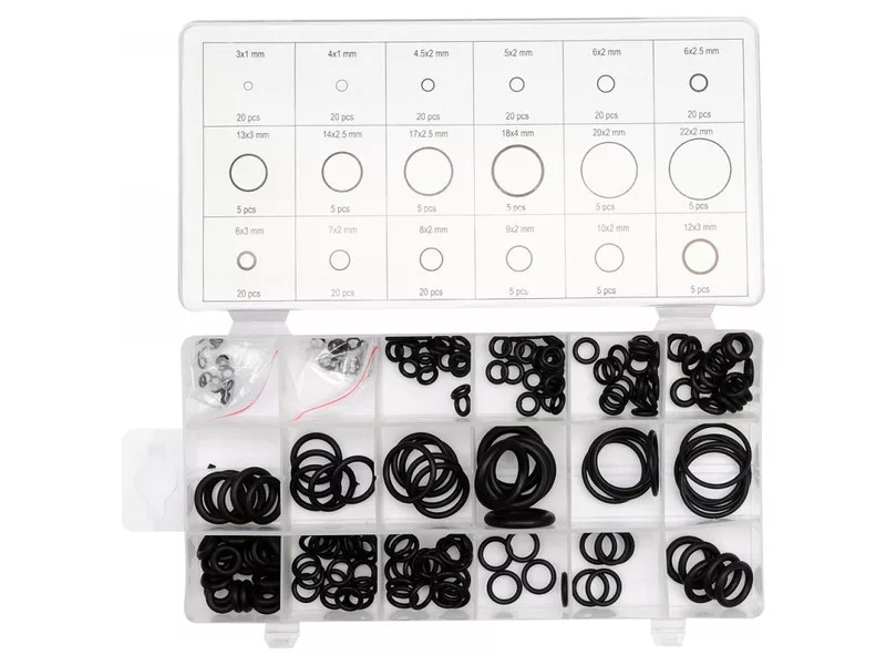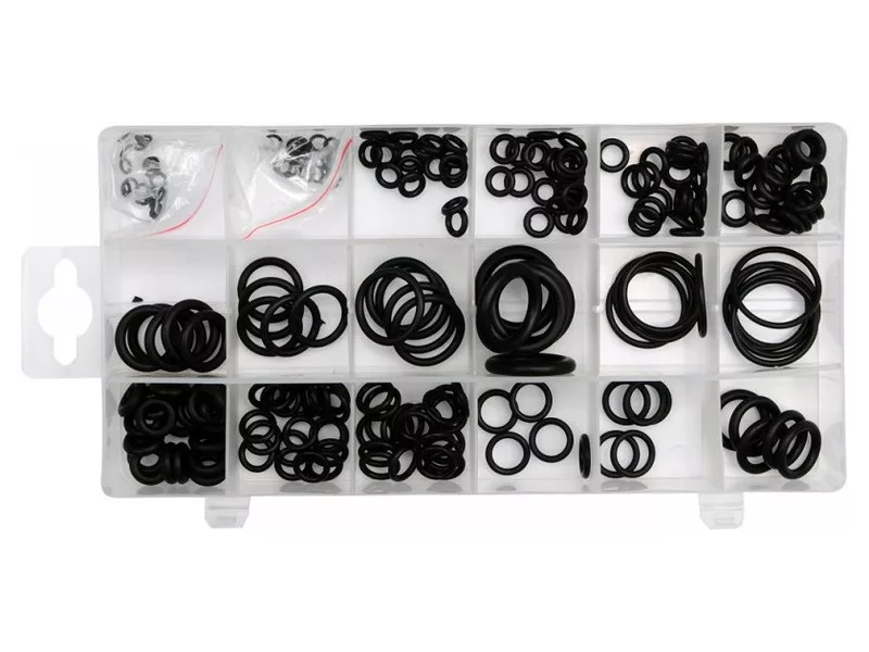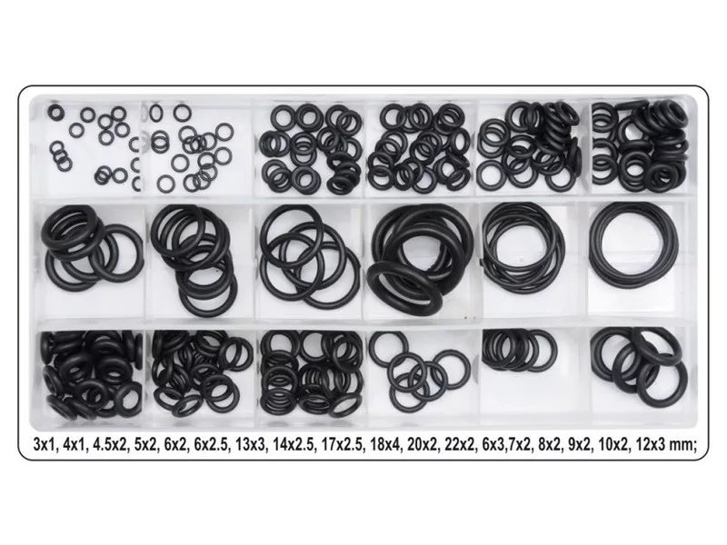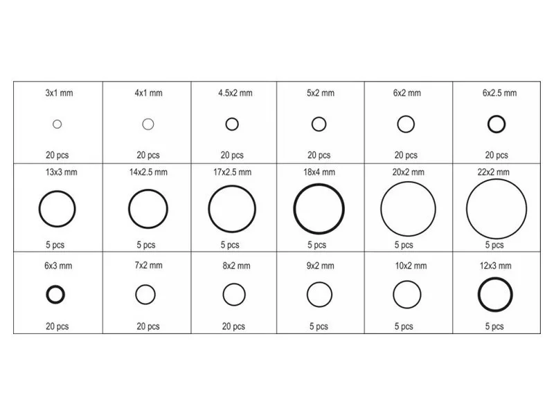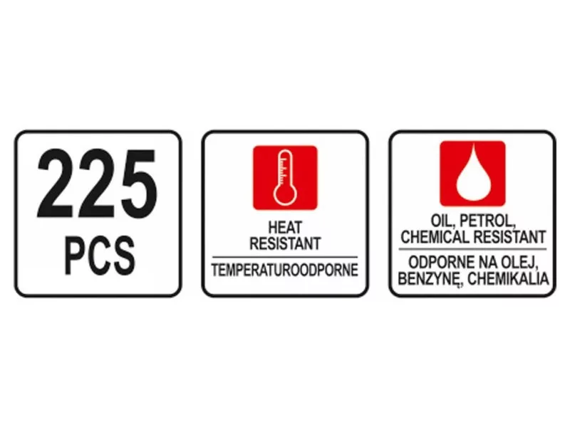 Gyakorlati 225 darabos gumigyűrű-szett. 18 különböző méretű gyűrűt tartalmaz. A gyűrűk olyan agresszív anyagoknak ellenálló gumiból készültek, mint az üzemanyagok, olajok és vegyszerek, valamint a magas hőmérséklet. A praktikus csomagolás könnyű hozzáférést biztosít a kényelmes mérethez.