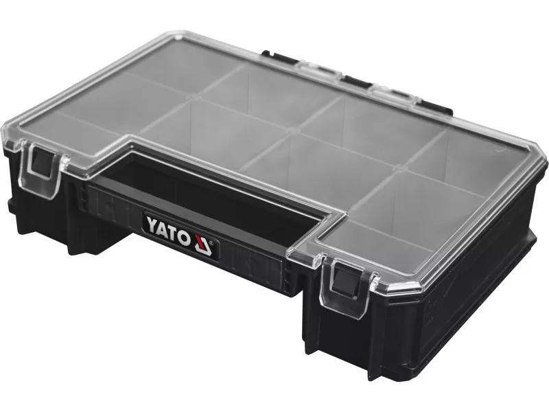 Szervező tartós policarbonát fedéllel, kis tartozékok tárolására, 6 eltávolítható rekeszzel rendelkezik. Használható YT-09164 tartozékdobozként, a YT-09163 doboz 5 szervezőt tartalmaz.
