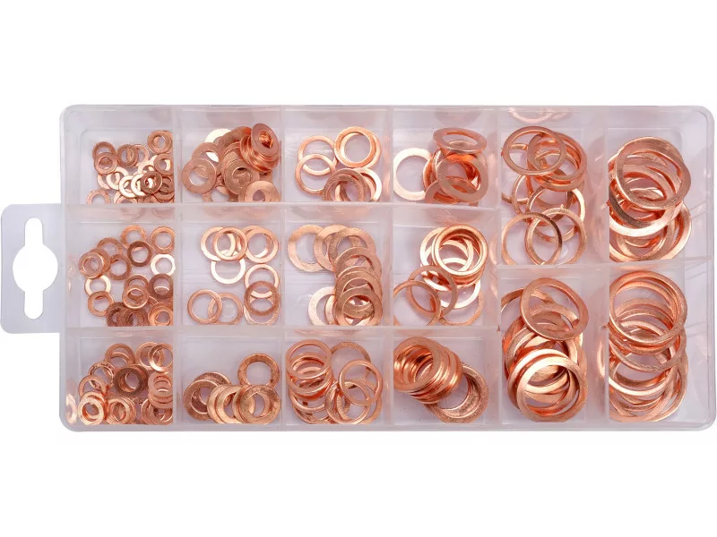 Lágy réz alátétek készlete. tartalmaz 25 alátétet mindegyikből: 4 x 8 x 1 mm 5 x 9 x 1 mm 6 x 10 x 1 mm 6 x 12 x 1 mm 10 alátét mindegyikből: 8 x 12 x 1 mm 8 x 14 x 1 mm 10 x 14 x 1 mm 10 x 16 x 1 mm 12 x 16 x 1.5 mm 12 x 18 x 1.5 mm 14 x 18 x 1.5 mm 14 x 20 x 1.5 mm16 x 20 x 1.5 mm 18 x 24 x 1.5 mm 20 x 26 x 1.5 mm 22 x 27 x 1.5 mm