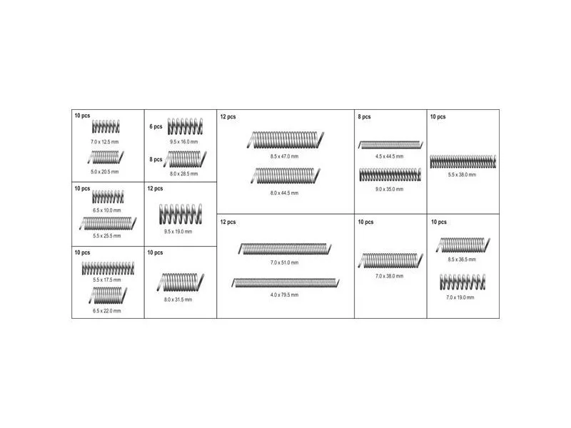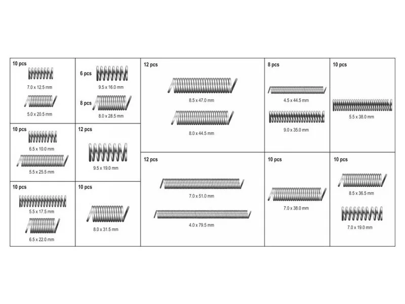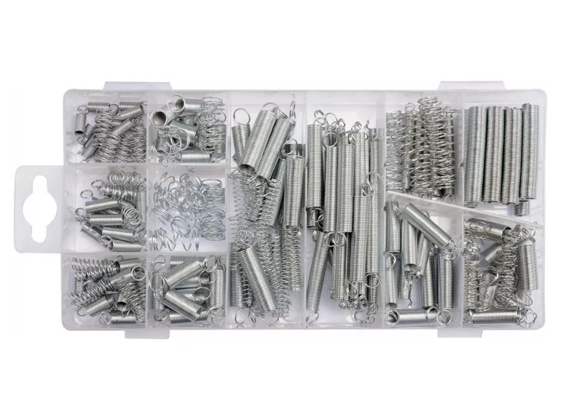 Rugókészlet, mely 200 különböző méretet tartalmaz. A rugók mind nyomó, mind húzó műveletekre alkalmasak. Az egész egy kényelmes "válogató" csomagolásban helyezkedik el.