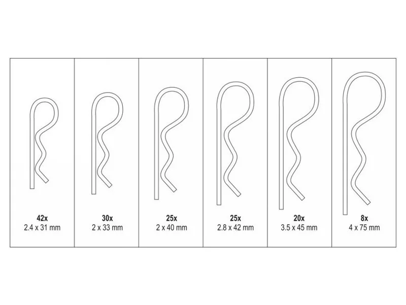 150 darabos rugalmas tűszeg készlet. A készlet 6 méretet tartalmaz 2,4x31 mm-től 4,0x75 mm-ig. Az egész egy kényelmes "válogató" csomagolásban található.