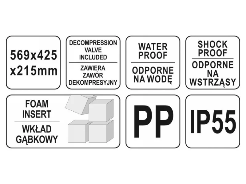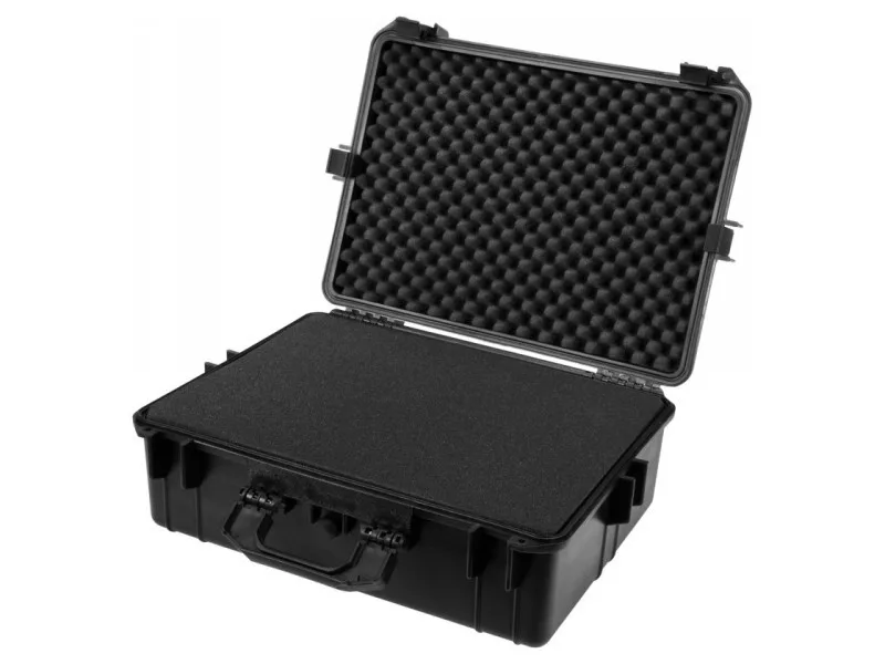 Hermatikus, vízálló és porálló bőrönd, ellenáll sokféle vegyszernek és korróziónak. Rugalmas polipropilénből készült az IP55 ellenállási osztály szerint. Hatékony tömítő rendszerrel rendelkezik, melyet egy dekompressziós szelep gazdagít a nyomás kiegyenlítésére légi szállítás során. Lakattal zárható. A bőrönd belseje szivaccsal van kitöltve, amely előre vágott, és különböző termékek, pl. szerszámok, fényképezőgép vagy mérőeszközök tárolására készült. A bőröndök remekül használhatók szorosan záró és mechanikai sérülésekkel szemben ellenálló tárolóként, pl. vitorlázás, off road típusú motorsport, stb. esetén. A megadott méretek a teljes külső méreteket jelentik. Falvastagság kb. 10 mm. Külső méretek [mm]: 569 x 425 x 215 Belső méretek [mm]: 505 x 355 x 140 fedél magasság [mm]: 60
