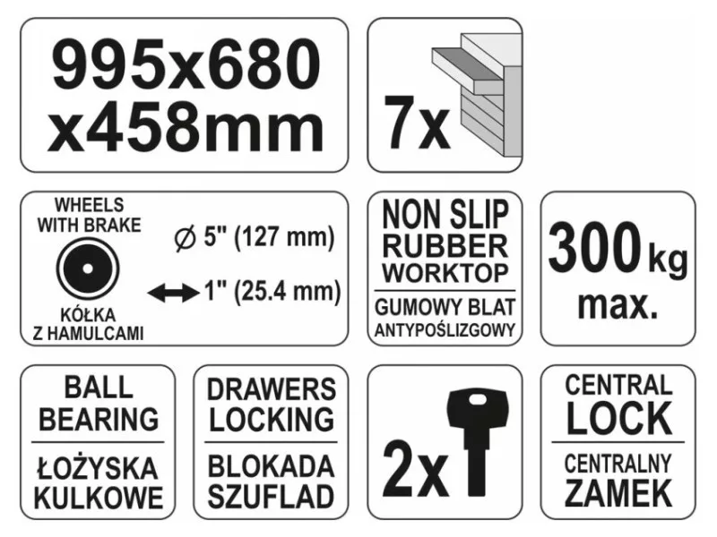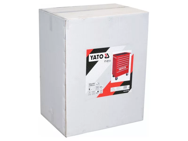 Yato szervizszekrény 7 golyósínnel ellátott fiókkal, melyek habbetéttel vannak bélelve. Masszív acéllemez profilokból készült. Olaj- és kopásálló gumiborítású munkalappal rendelkezik. A szekrény nagy méretű gumikerékpárokkal van felszerelve, melyek közül kettő forgatható, fékkel védett. Magas, akár 300 kg terhelésnek is ellenáll. Autószerelő műhelyek és járműszervizek elengedhetetlen eszköze.