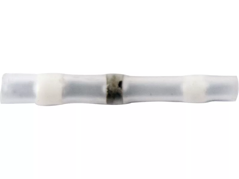 Átlátszó YT-81440 hőre zsugorodó cső, közepén ónnal és a két oldalán hőre aktiválódó ragasztóval a csatlakozás további lezárására.